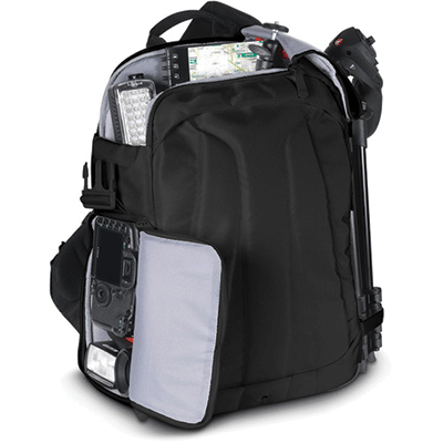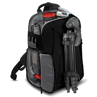 کیف کوله پشتی زیبا و بادوام و دارای ظرفیت یک دوربین DSLRبا لنز متصل شده،2 یا 3 لنز اضافی،لوازم جانبی(کابل،شارژر،کارت حافظه)،نگدارنده سه پایه( در داخل کیف و خارج کیف )