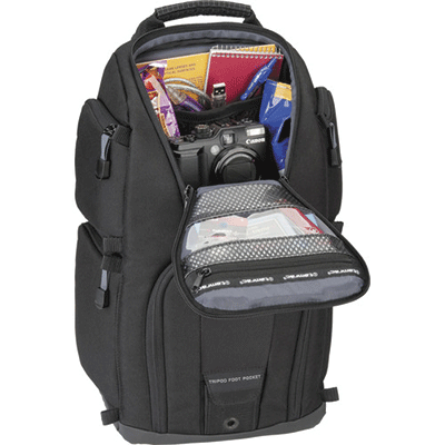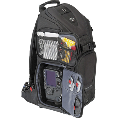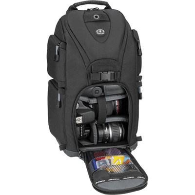 کیف کوله پشتی زیبا و دارای ظرفیت دوربین DSLR به همراه لنز متصل شده اش ، یک یا دو لنز اضافی و فلاش،همچنین سه راه برای دسترسی به تجهیزات عکس وجود دارد - از طریق درب جلو و از طریق دو درب سمت راشت و چپ.