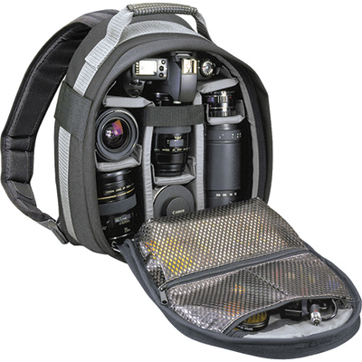 کیف کوله پشتی کوچک با دسترسی از جلو ، مناسب برای نگهداری اغلب دوربین های DSLR به همراه یک لنز تا طول 7 اینچ ،3 یا 4 لنز اضافی و لوازم جانبی