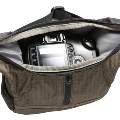 کیف شانه آویز ونگارد زیبا و بادوام و دارای ظرفیت 1 عدد دوربین DSLR با لنز زوم متوسط متصل شده،1لنزاضافی و لوازم جانبی (کارت حافظه، کابل، باتری و شارژر)