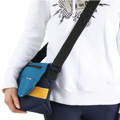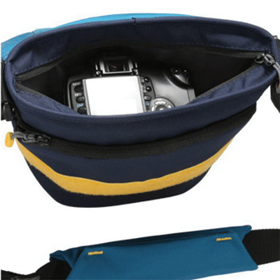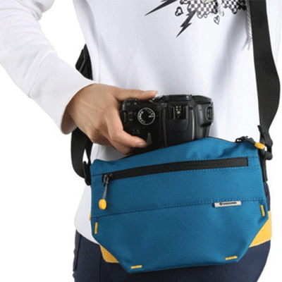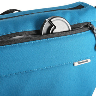 کیف شانه آویز ونگارد زیبا و بادوام دارای ظرفیت 1 عدد دوربین DSLR با لنز زوم استاندارد متصل شده، 1 فلاش سایز کوچک و لوازم جانبی (کارت حافظه، کابل، باتری و شارژر)
