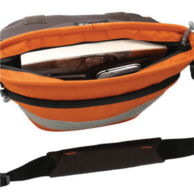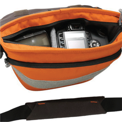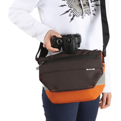 کیف شانه آویز زیبا و بادوام و دارای ظرفیت1 عدد دوربین DSLR با لنز زوم متوسط متصل شده،1لنزاضافی، 1 فلاش و لوازم جانبی (کارت حافظه، کابل، باتری و شارژر)، به علاوه یک تبلت کوچک.